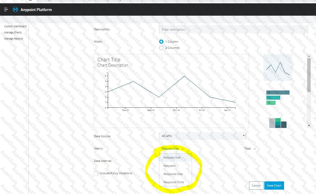 Correct answer is Request size, number of requests, response size, response time Analytics API Analytics can provide insight into how your APIs are being used and how they are performing. From API Manager, you can access the Analytics dashboard, create a custom dashboard, create and manage charts, and create reports. From API Manager, you can get following types of analytics: - API viewing analytics - API events analytics - Charted metrics in API Manager