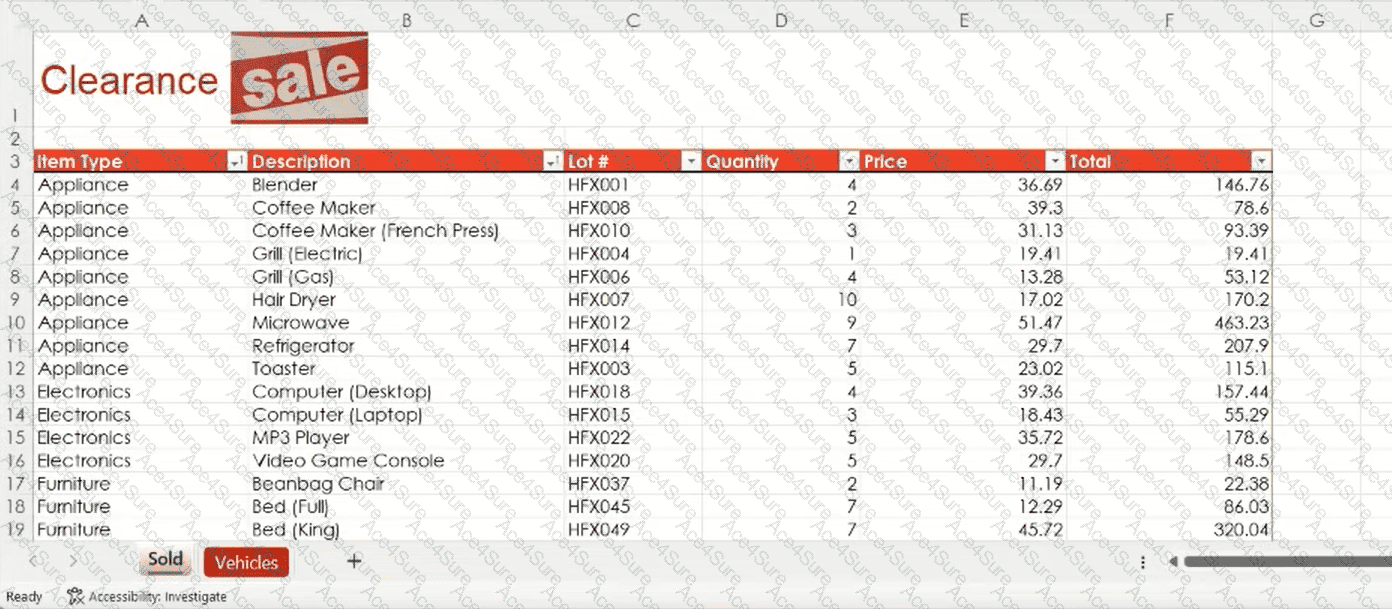 You are the administrative assistant for a retail company that is going out of business. You've been tasked to prepare a workbook for the clearance sale.