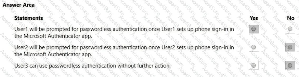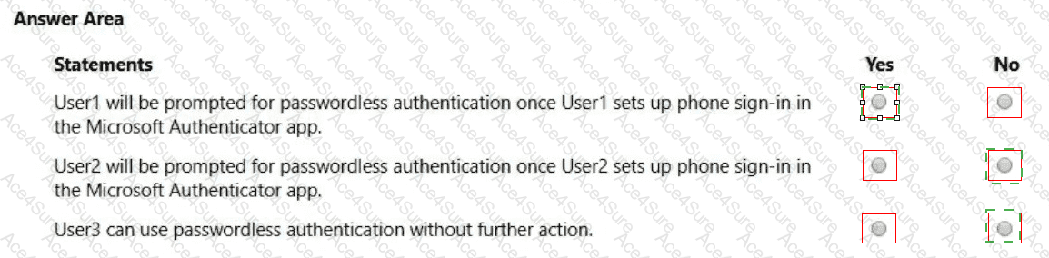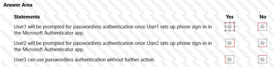 Both User1 and User2 report that they are NOT prompted for passwordless sign-in in the Microsoft Authenticator app.