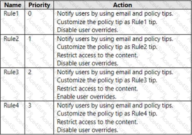 You have a Microsoft 365 E5 subscription that contains a Microsoft SharePoint site named Site1 and a data loss prevention (DLP) policy named DLP1. DLP1 contains the rules shown in the following table.