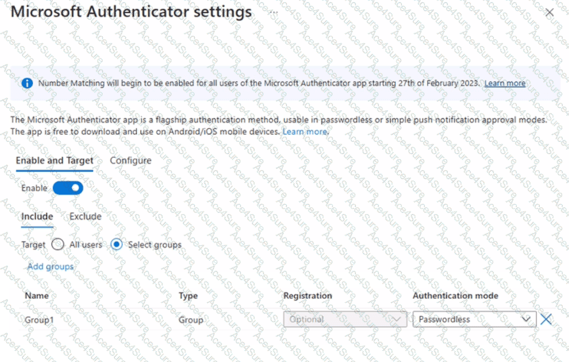 From Microsoft Authenticator settings for the subscription, the Enable and Target settings are configured as shown in the exhibit. (Click the Exhibit tab.)