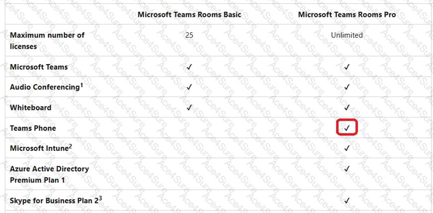 The following table shows the services included in each Teams Rooms license.