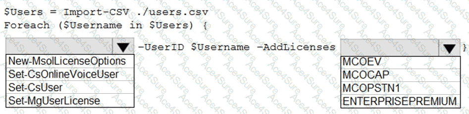 How should you complete the PowerShell script? To answer, select the appropriate options in the answer area.