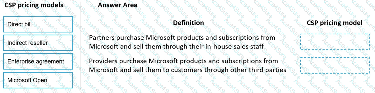 Instructions: To answer, drag the appropriate CSP pricing model from the column on the left to the definition on the right. Each CSP pricing model might be used once, more than once, or not at all.