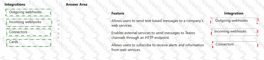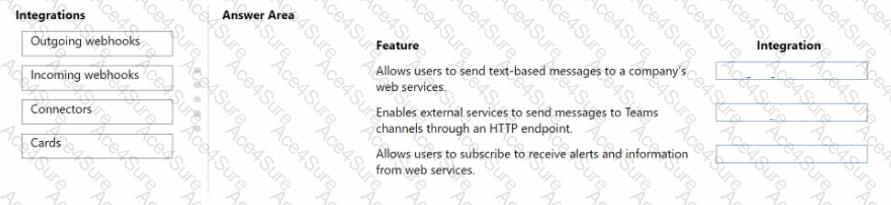 Which app integrations should you recommend' To answer, drag the appropriate integrations to the correct features. Each integration may be used once, more than once, or not at all. You may need to drag the split bar between panes or scroll to view content.