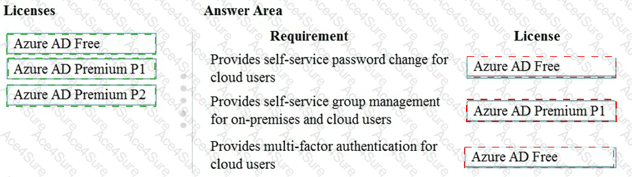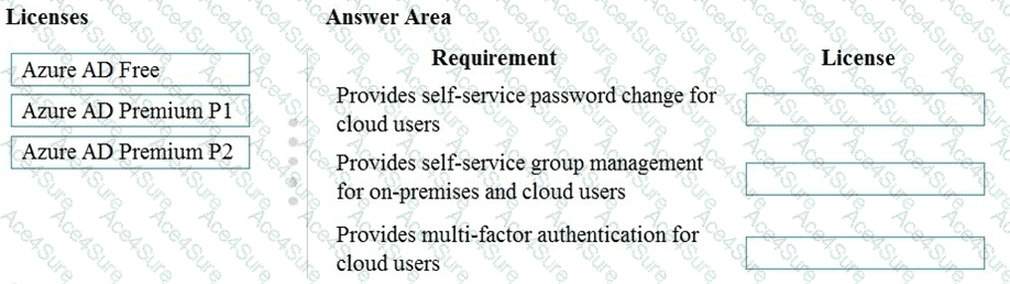 Match each Azure AD license toits requirement. To answer, drag the appropriate Azure AD license from the column on the left to its requirement on the right. Each Azure AD license may be used once, more than once, or not at all.
