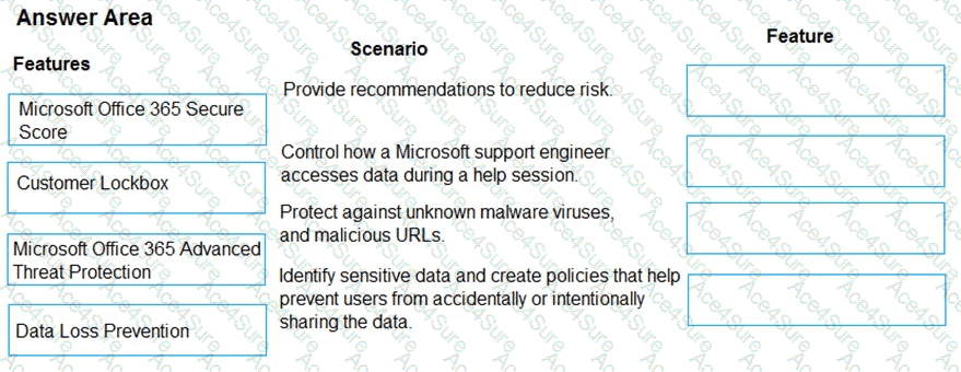 Which features should you implement? To answer, drag the appropriate features to the correct scenarios. Each feature may be used once, more than once, or not at all. You may need to drag the split bar between panes or scrollto view content.