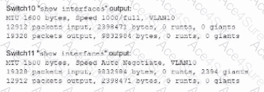 A network technician is troubleshooting network latency and has determined the issue to be occuring two network switches( Switch10 and Switch11). Symptoms reported included poor video performance and slow file copying. Given the following informtion: