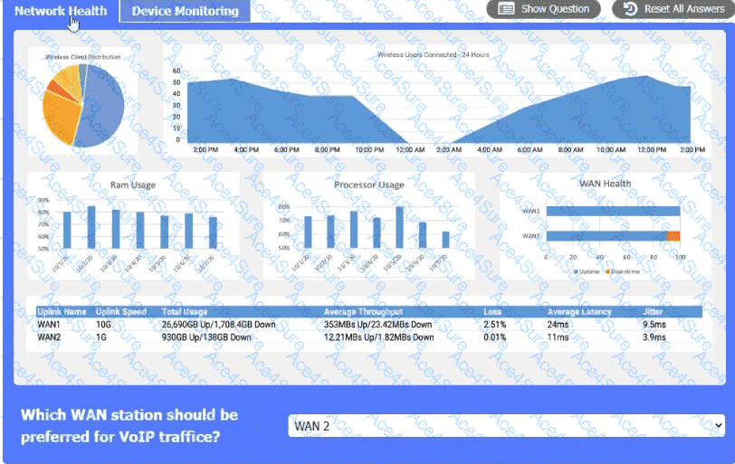 WAN 2 appears to have a lower average latency and loss percentage, which would make it the preferred WAN station for VoIP traffic. VoIP traffic requires low latency and packet loss to ensure good voice quality and reliability. WAN 1 seems to have higher RAM and processor usage, which could also affect the performance of VoIP traffic.