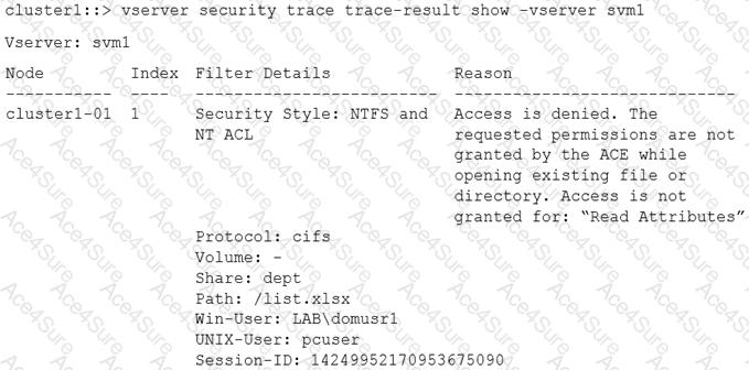 You perform a security trace when troubleshooting a data access problem for a user. The results are shown in the exhibit.