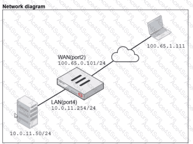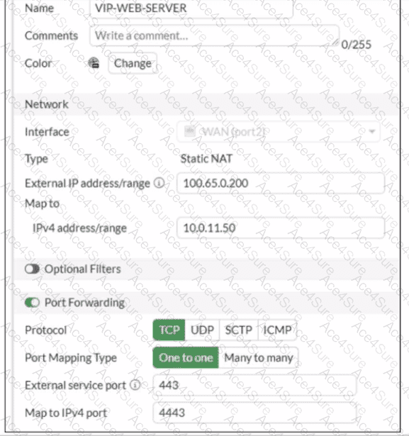 If the host 100.65.1.111 sends a TCP SYN packet on port 443 to 100.65.0.200. what will the source address, destination address, and destination port of the packet be at the time FortiGate forwards the packet to the destination?