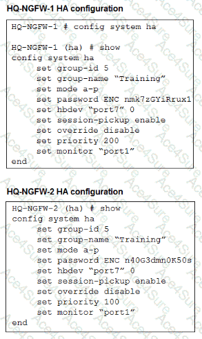 Both HA members are configured with set override disable , so FGCP does not prefer the higher-priority unit first. With override disabled, the election order is based on monitored interfaces , then HA uptime , then priority , and finally serial number . Since the cluster has been running for one week , the secondary unit will have a much higher HA uptime than a unit whose uptime is reset to zero. Therefore, if the administrator runs diagnose sys ha reset-uptime on the current primary HQ-NGFW-1 , FGCP re-evaluates election and the other member can take over.