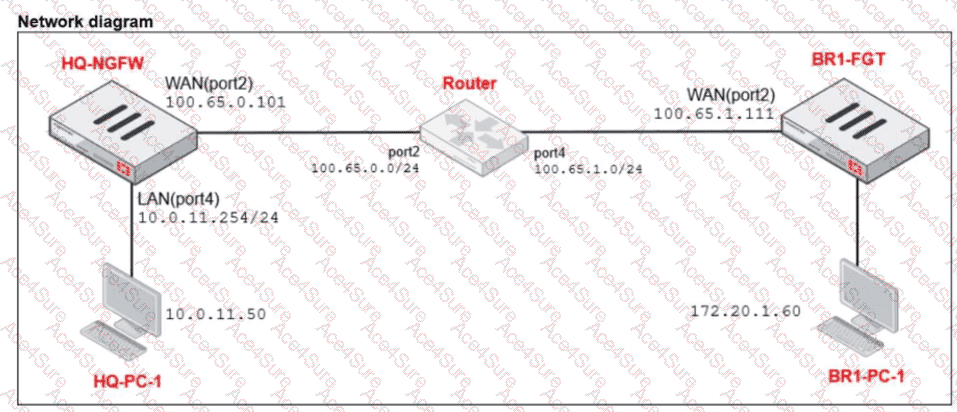 Which IP address will be used to source NAT (SNAT) the traffic, if the user on HQ-PC-1 (10.0.11.50) pings the IP address of BR-FGT (100.65.1.111)?