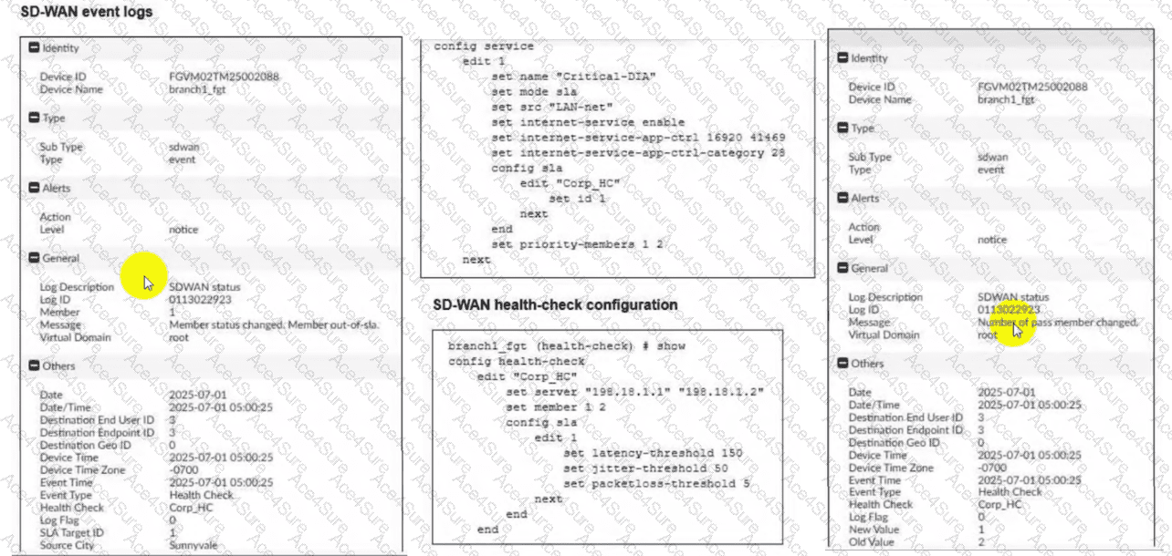 Steering Decision: Because the rule strategy is mode sla and the primary preferred member (port1) is now out-of-sla, the FortiGate immediately disqualifies Member 1 from the selection pool for this specific rule. It then moves to the next available member in the priority list that does satisfy the SLA, which is Member 2 (port2).