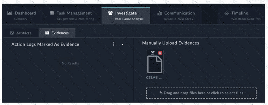 Evidence Tagging:To populate theAction Logs Marked As Evidencesection, an analyst must specifically tag a relevant log entry, a playbook output, or a comment within the collaboration workspace with the system-defined keyword"Evidence".