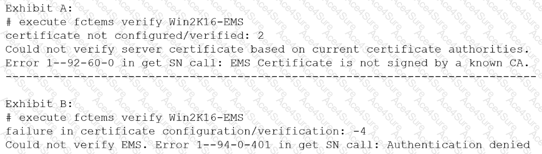 The exhibit shows two error messages from a FortiGate root Security Fabric device when you try to configure a new connection to a FortiClient EMS Server.