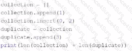 collection = [] collection.append(1) collection.insert(0, 2) duplicate = collection duplicate.append(3) print(len(collection) + len(duplicate))