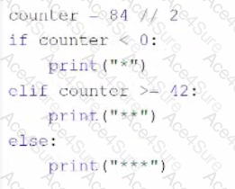 The code starts with checking if the value of “counter” is less than 0. If yes, it prints a single asterisk () to the screen and exits the statement. If no, it checks if the value of “counter” is greater than or equal to 42. If yes, it prints three asterisks () to the screen and exits the statement. If no, it prints two asterisks () to the screen and exits the statement.