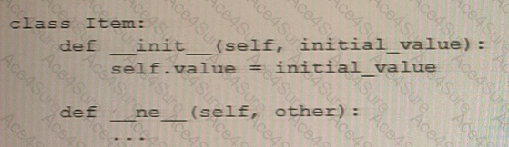 The correct answer is D. The code is responsible for the support of the inequality operator i.e. i != j. In the given code snippet, the __ne__ method is a special method that overrides the behavior of the inequality operator != for instances of the MyClass class. When the inequality operator is used to compare two instances of MyClass, the __ne__ method is called to determine whether the two instances are unequal.