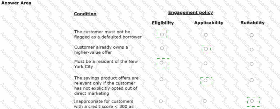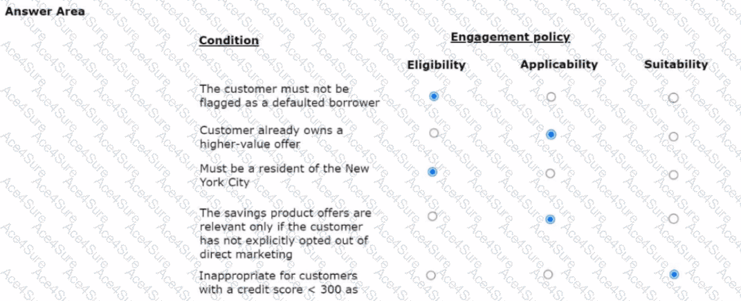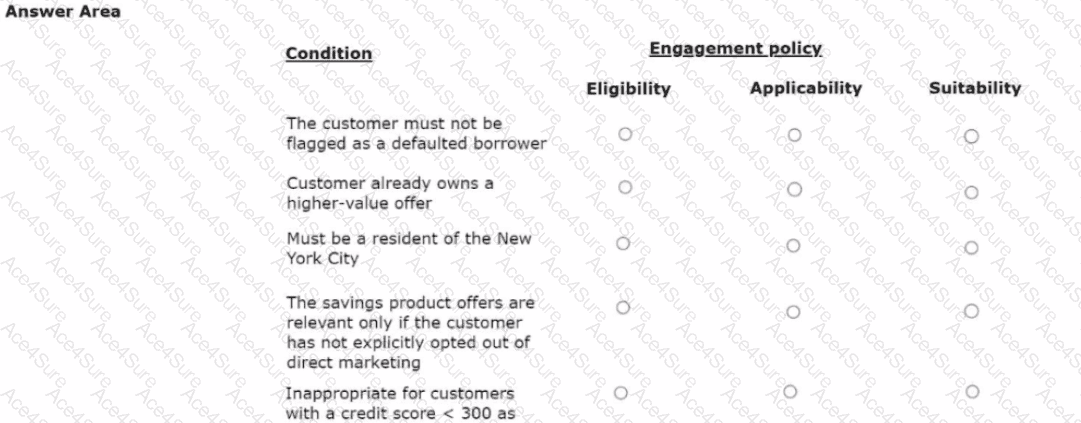 U+ Bank, a retail bank, has recently implemented a project in which credit card offers are presented to qualified customers when they log in to the web self-service portal. The bank added engagement policy conditions to show the offers based on the bank's requirements.