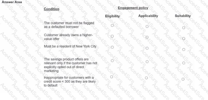 U+ Bank, a retail bank, has recently implemented a project in which credit card offers are presented to qualified customers when they log in to the web self-service portal The Dank added engagement policy conditions to show the offers based on the bank's requirements.