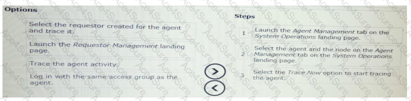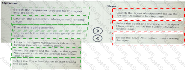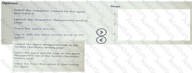 select and move the three option that are required for tracing an agent on one of the nodes in a cluster to the step column and place them in the correct order