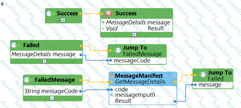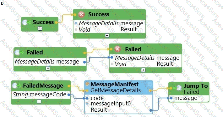 The business requirements states that the login automation creates a Success or Failed response when attempting to log in to the finance application. If a failure occurs, the automation should pass a message code with the Message Manifest before exiting the automation.