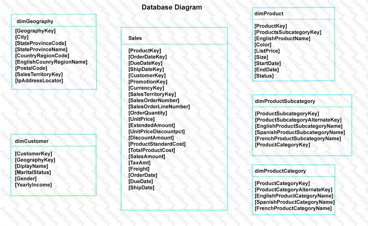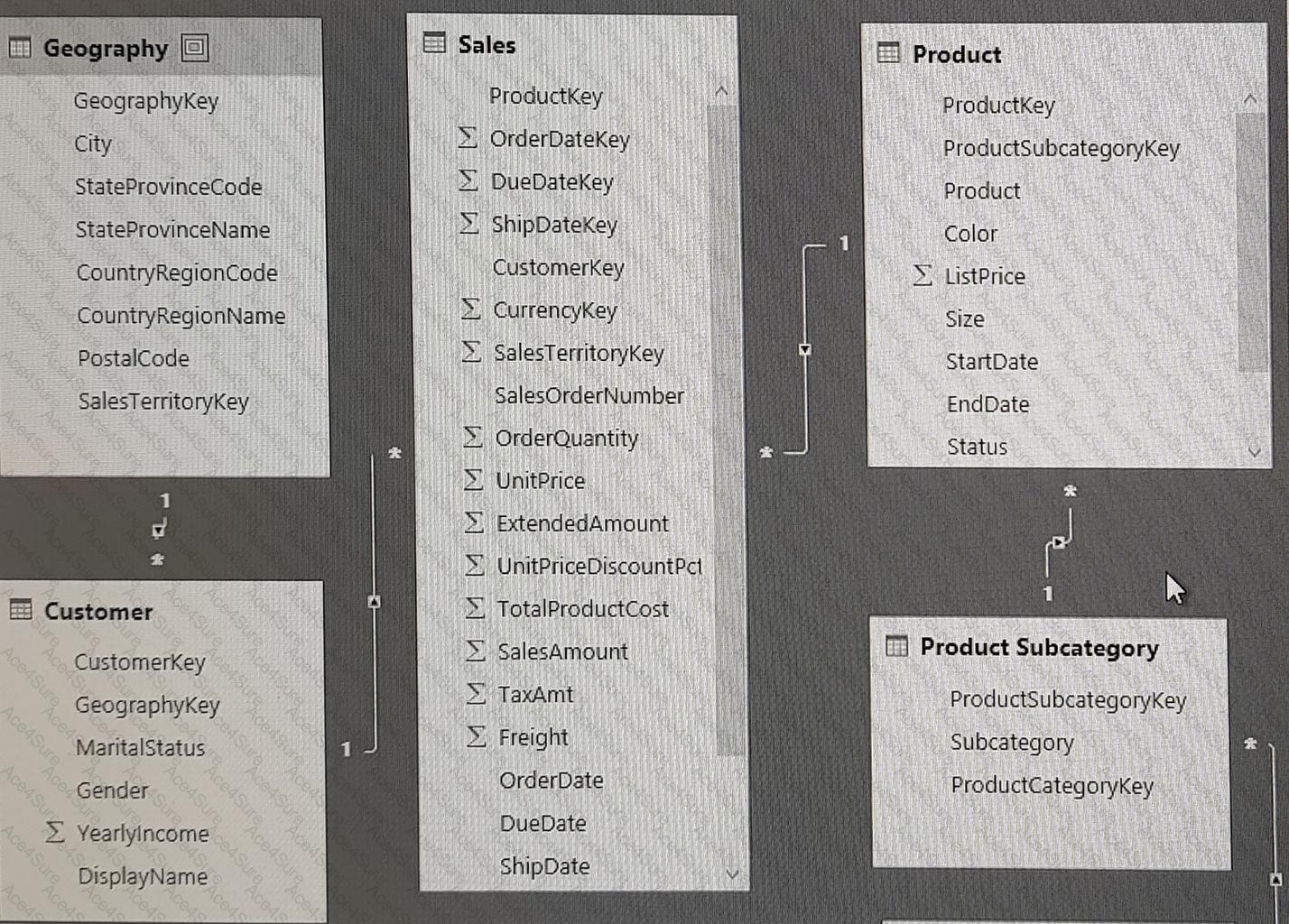You plan to develop a Power BI model as shown in the Power BI Model exhibit. (Click the Exhibit).