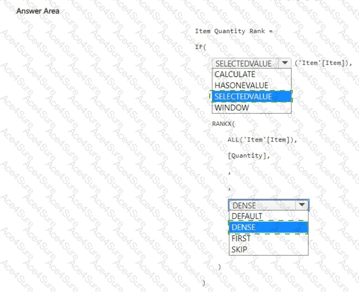 How should you complete the DAX formula? To answer, select the appropriate options in the answer area.