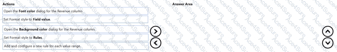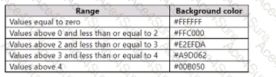 You have a Power Bl report that contains a table visual with a measure named Revenue. The Revenue measure returns values within a range of 0 to S. You need to formal the visual so that the Revenue column displays a specific background color based on the value range shown in the following table.