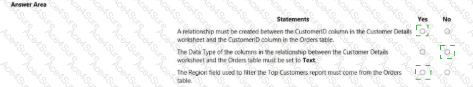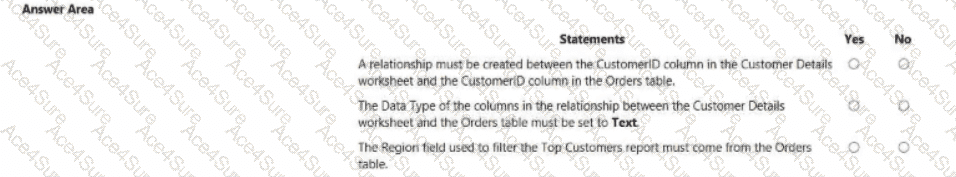You need to design the data model and the relationships for the Customer Details worksheet and the Orders table by using Power BI. The solution must meet the report requirements.
