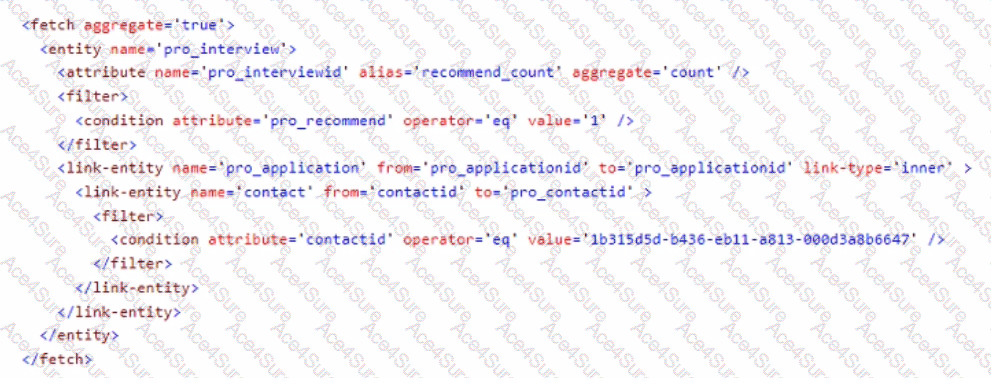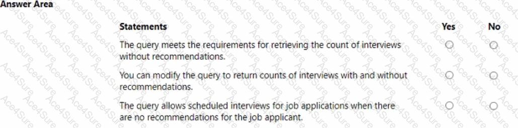You create the following Fetch XML query to determine the number of interviews where there are no recommendations for an applicant.