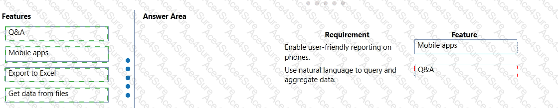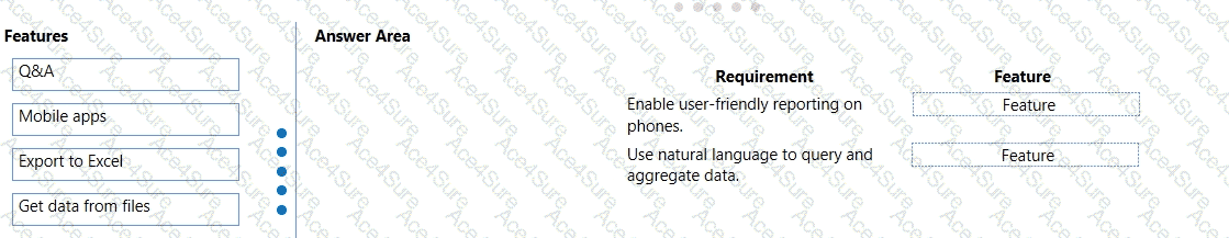 Match each Power Bl feature to its requirement. To answer, drag the appropriate features from the column on the left to its requirement on the right. Each option may be used once, more than once, or not at all.