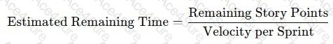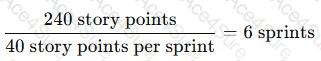 The product owner is present at the sprint review meeting and states that an estimation for the end of the project must be shared with the company’s steering committee. The scrum master declares that the team reached an average velocity of 40 story points per sprint, considering a biweekly iteration. The team members predict that there are 240 story points remaining.