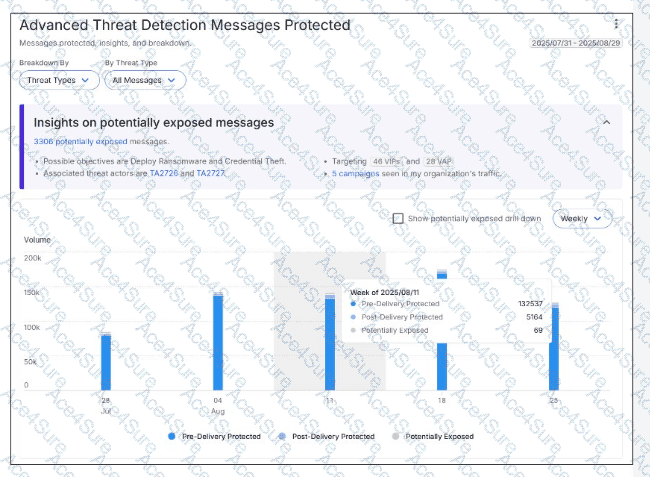 Based on the metrics for the highlighted week, how many malicious messages were blocked by TAP at the email gateway?