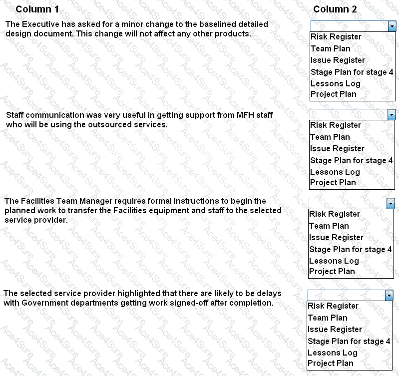 Column 1 is a list of entries from the Daily Log that occurred during stage 4 in the Controlling a Stage process. For each entry in Column 1, select the first management product from Column 2 that should have been updated, or created, as a result of the entry. Each selection from Column 2 can be used once, more than once or not at all.