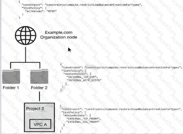 The provided resource hierarchy has an organization node (Example.com), folders (Folder 1 and Folder 2), and a project (Project 2) under Folder 2 with a specific VPC (VPC A).