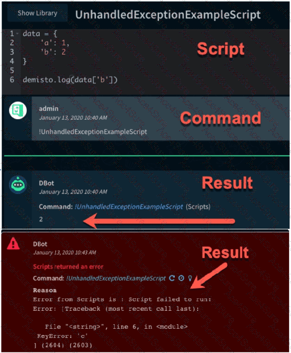 The images show two versions of the same automation script and the results they produce when executed in Demisto. What are two possible causes of the exception thrown in the second Image? (Choose two.)