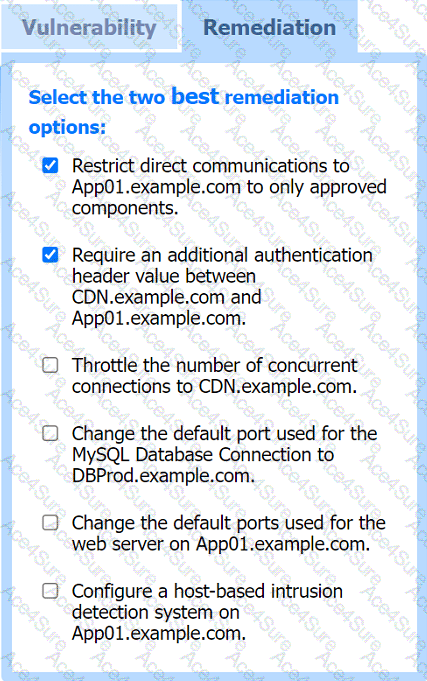 Require an additional authentication header value between CDN.example.com and App01.example.com: Adding an authentication layer between the CDN and the app server helps ensure that requests are legitimate and originate from trusted sources, mitigating SSRF and other indirect attack vectors.