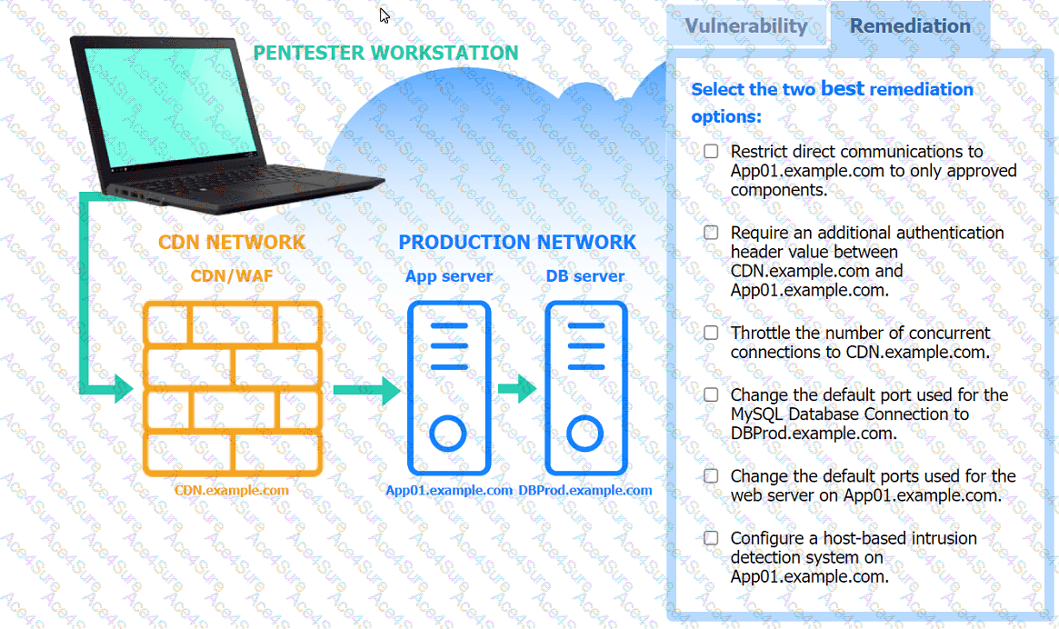 The scenario suggests that the CDN network (with a WAF) can be used to perform a Server-Side Request Forgery (SSRF) attack. Since the penetration tester has the pentester workstation interacting through the CDN/WAF and the production network is behind it, the most plausible attack vector is to exploit SSRF to interact with the internal services like App01.example.com.