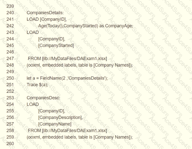 A business analyst reports that the 'CompanyAge' field does NOT display for users The data architect examines the LOAD script and wants to place the breakpoint in the script to check the field name.