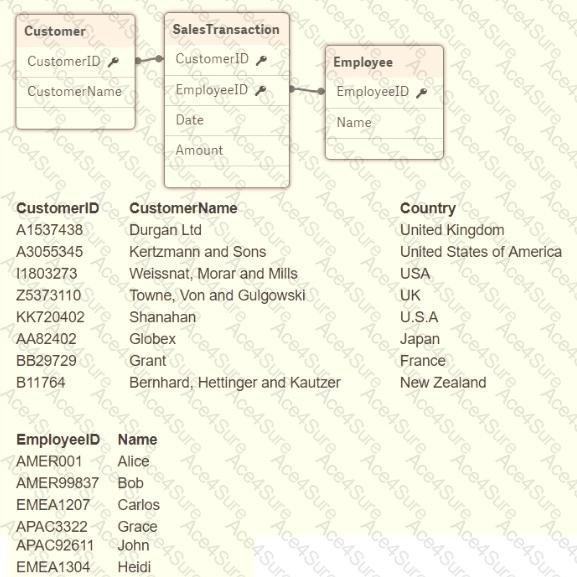 A global sales organization operates in three regions: AMERICAS, EMEA: and APAC. Each region stores its sales transactions in a separate database in which the employees update customer data through a third-party app. The data is extracted into three QVDs.