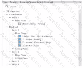 In the given exhibit, the Project Browser structure shows views grouped first by discipline (“Coordination,” “Electrical”), then by level (“Level 1,” “Level 2”), and finally by view type (e.g., “Floor Plans,” “Ceiling Plans”). This organization allows the electrical designer to isolate MEP-related views while maintaining logical grouping under each building level.