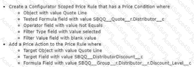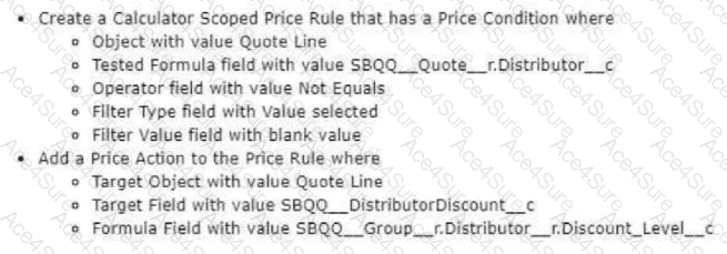 Universal Containers has set up an Account lookup field, Distributor__c, on the Quote to identify different distributors per group. Distributor accounts have a Discount_Level__c field populated with the base discount percentage that products provided by that distributor will receive.
