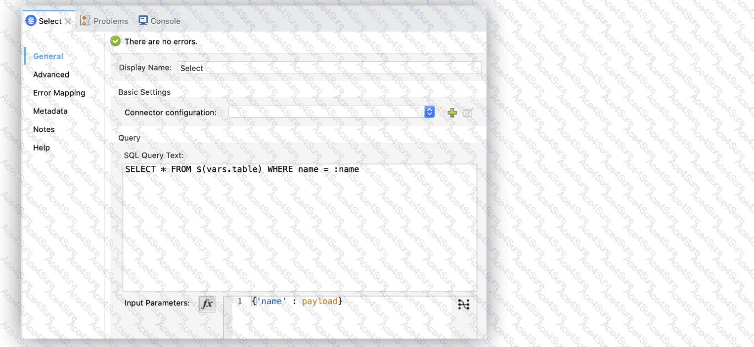 In the following example, you configure a dynamic query by using a full expression with a string in which the table depends on a variable $(vars.table). Althoughsome of the query text is dynamic ("SELECT * FROM $(vars.table)), the WHERE clause still defines the WHERE condition using input parameters: in this case, WHERE name = :name.