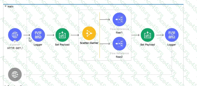 In the execution of the Scatter_Gather, the flow1 route completes after 10 seconds and the flow2 route completes after 20 seconds.