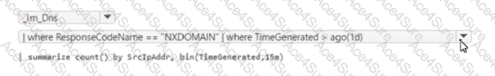 You need to query the ASIM DNS schema to list all the DNS events from the last 24 hours that have a response code of 'NXDOMAIN' and were aggregated by the source IP address in 15-minute intervals. The solution must maximize query performance.