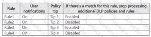 You need to ensure that if a user uploads a document to Site1 that matches all the rules, the user will be shown the Tip 2 policy tip. What should you do?
