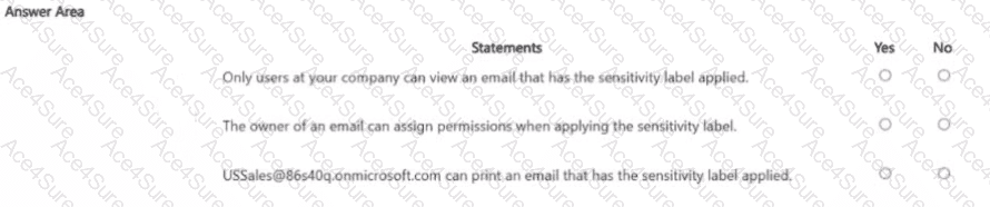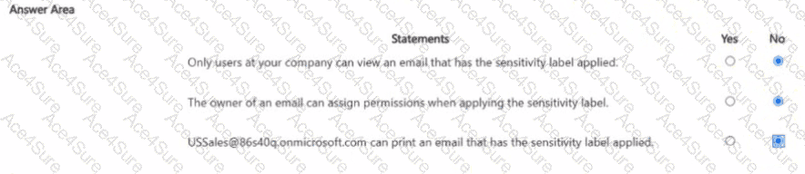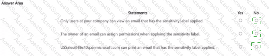 [Reference: Restrict access to content with sensitivity labels, , Statement 1: Only users at your company can view an email that has the sensitivity label applied., , False, because permissions are explicitly assigned to two groups (LegalTeam, USSales)., , If any external users were added, they would also get access. The configuration does not inherently restrict to only internal users., Answer: NO, , Statement 2: The owner of an email can assign permissions when applying the sensitivity label., , False, because the sensitivity label was configured with “Assign permissions now”., , This means permissions are fixed by admins and cannot be modified by the email sender., , If "Let users assign permissions" was enabled, this would be YES., Answer: NO, , ???? Statement 3: USSales@86s40q.onmicrosoft.com, can print an email that has the sensitivity label applied., , USSales group has the Reviewer role., , Reviewer = Can view, read, and save, but cannot print, copy, or export., Reference: Usage rights and role mapping for sensitivity labels, , Answer: NO, , ]