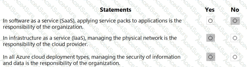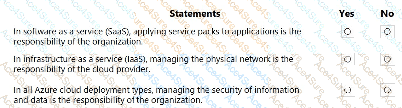 Microsoft’s shared-responsibility model states that the cloud provider secures the cloud, while the customer secures what they put in the cloud. The Azure Security documentation explains: “Regardless of the type of deployment, you always retain responsibility for your data, endpoints, accounts, and access management.” This applies to IaaS, PaaS, and SaaS, so statement 3 is Yes because the organization is always accountable for the security of information and data.